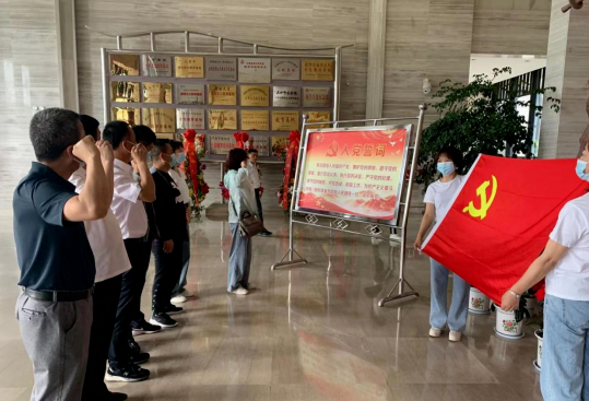 在莊嚴(yán)的紀(jì)念館序廳革命先輩浮雕前,全體黨員干部面對(duì)鮮紅的黨旗重溫了入黨誓詞。