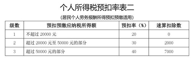 勞務(wù)報(bào)酬所得適用20%至40%的超額累進(jìn)預(yù)扣率(見《個(gè)人所得稅預(yù)扣率表二》)。